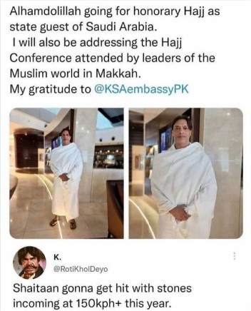 As pilgrims perform a Hajj ritual called Rami al Jamart [Stonning of the Devil], the user while referring to Akhtar’s record bowling speed wrote: “Shaitaan gona get hit with stones coming at 150kph+ this year”.