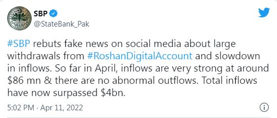 “So far in April, inflows are very strong at around $86 million there are no abnormal outflows,” said the SBP in the tweet, adding that the inflows have now surpassed $4bn.
