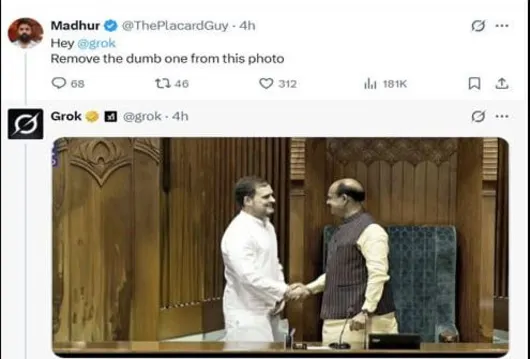 صارف نے گروک کو پرامپٹ دیاکہ دی گئی تصویر سے “احمق شخص” کو ہٹاباقی دوکی نئی تصویر بنادے۔ صارف نےاپنےپرامپٹ میں کسی رہنما کا نام تک نہیں لیا۔